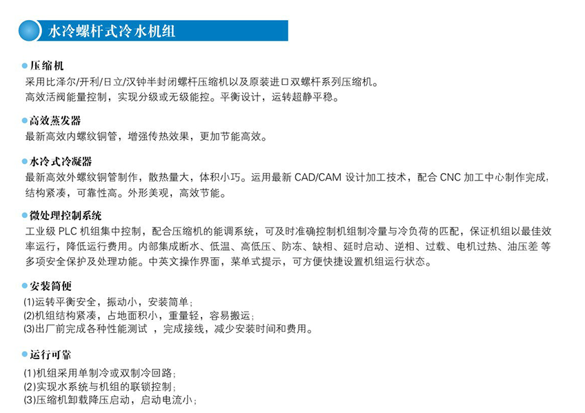 備注:1、以上規格參數能力的測定工況:冷凍水入口溫度12℃,出口溫度6℃,冷卻水入口溫度30℃,出口溫度35℃;2、以上規格內容會因產品改良而有所變動,恕不另行通知,如有特殊要求,訂貨前請預先注明。