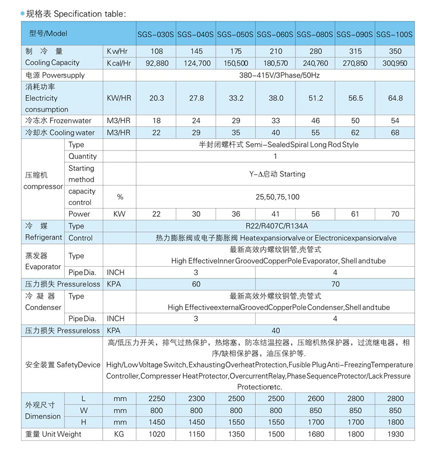 1、以上規格參數能力的測定工況:冷凍水入口溫度12℃,出口溫度6℃,冷卻水入口溫度30℃,出口溫度35℃;